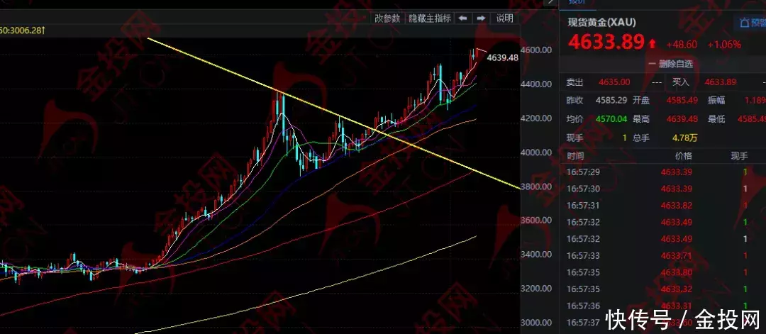 隔夜,现货黄金一度触及4634.33美元的历史新高,但随后迅速回落,收盘仅稳定在4586美元附近。今日欧市盘中,黄金延续涨势,一度涨至4639.39美元,再创历史新高,目前在4637美元附近徘徊。