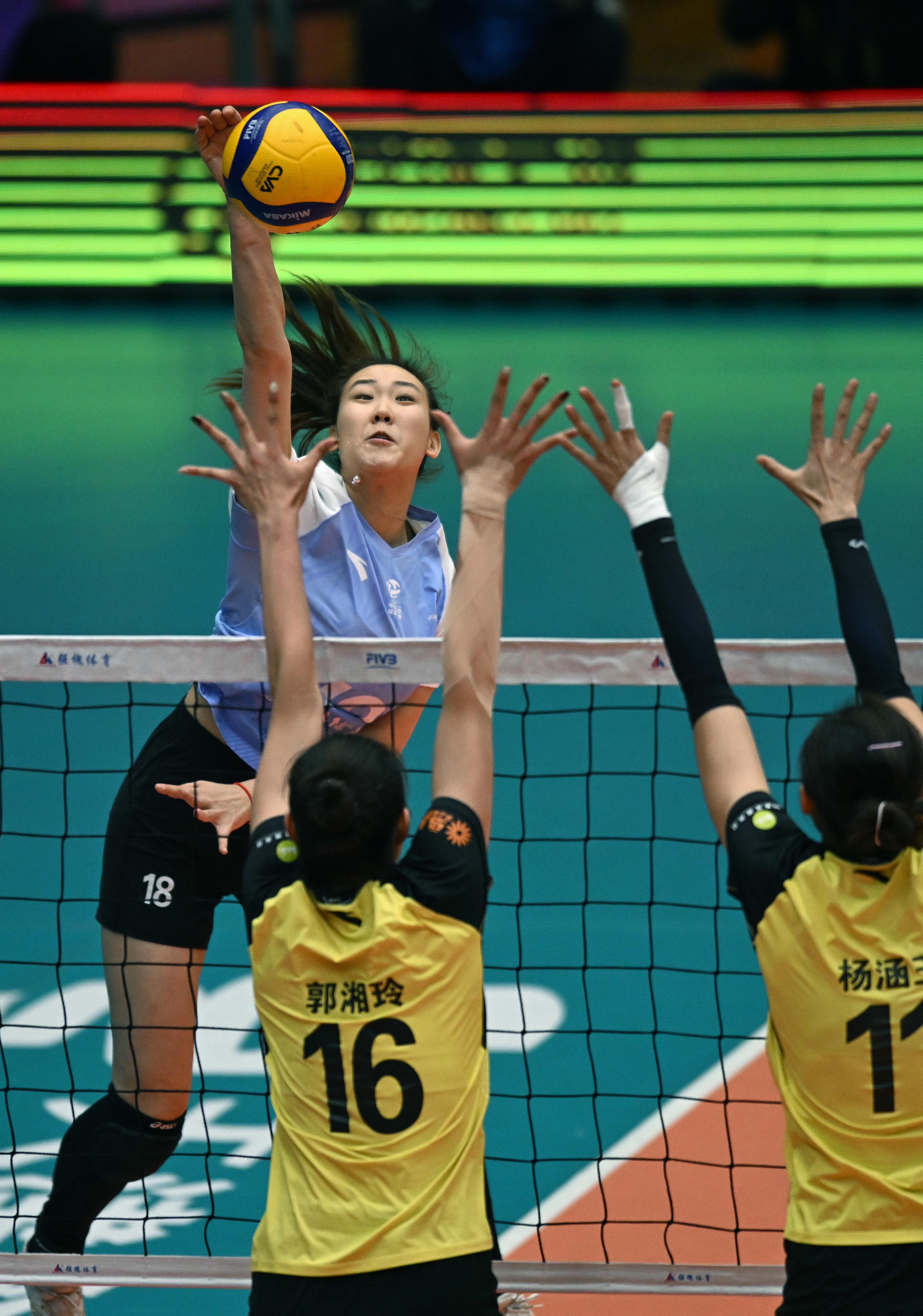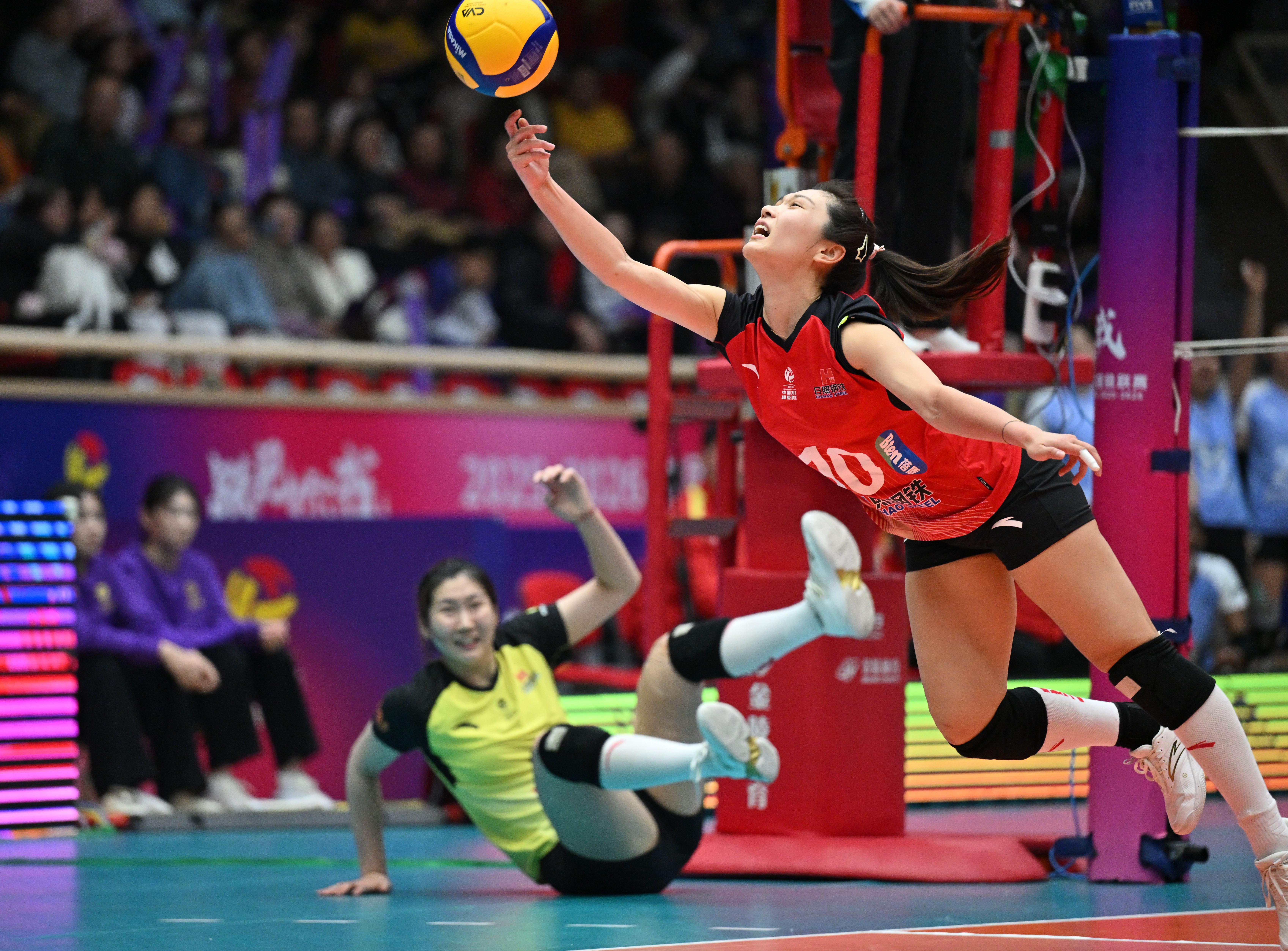 3月25日,山东日照钢铁队球员郭湘玲(右)在比赛中扣球。新华社记者 赵子硕 摄