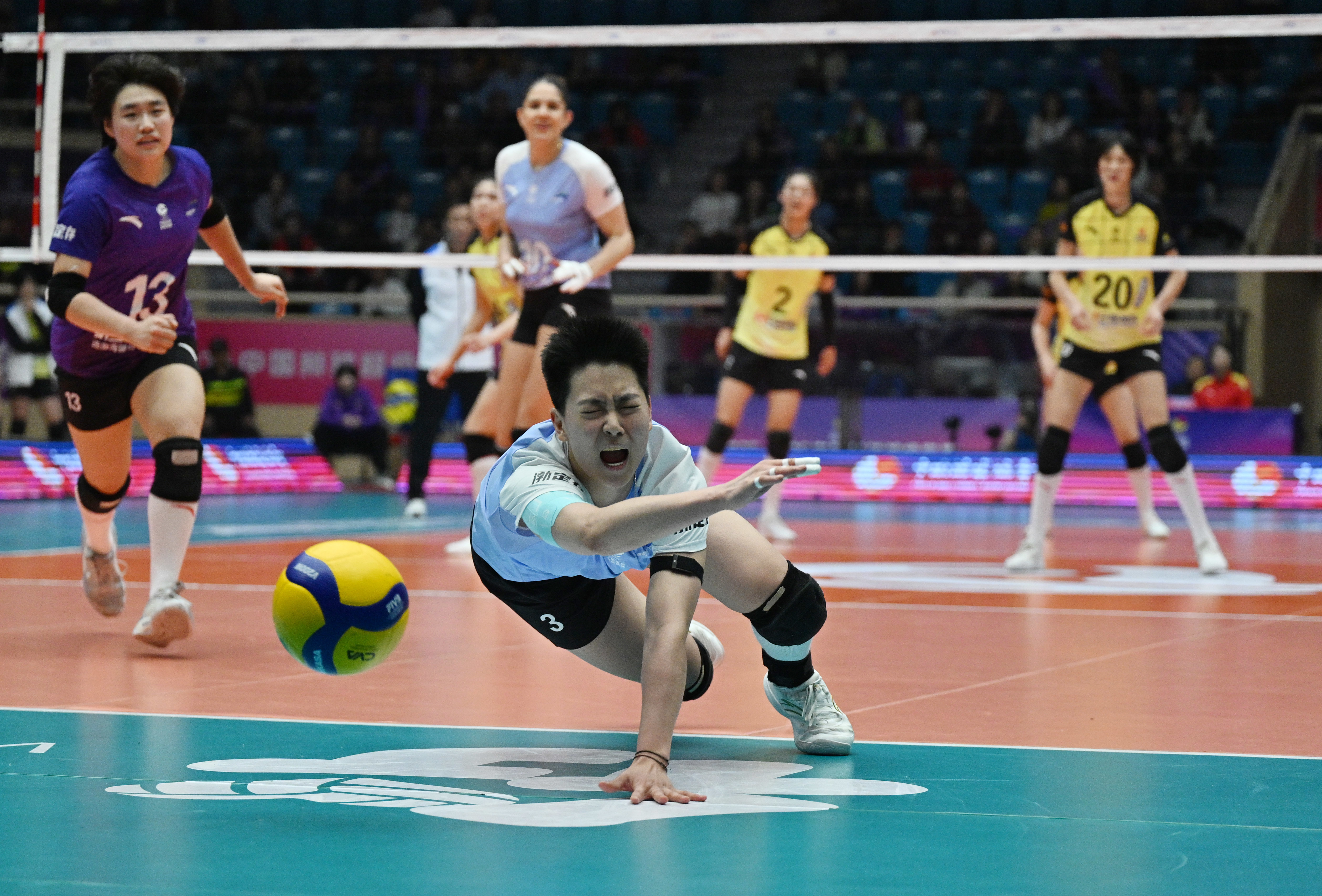 3月25日,天津渤海银行队球员刘美君(前)在比赛中救球。新华社记者 赵子硕 摄